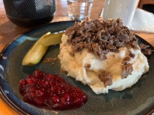返回Rovaniemi的路上,我们在Sodankylä休息了片刻,在Sodankylän Olohuone Tähti吃了最有拉普兰特色的麋鹿肉土豆泥。可以说,来拉普兰必须吃的一道菜了。这家饭店做得不错,麋鹿肉不腥,与puolukka果酱是天作之合。