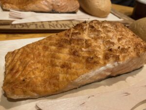 回到Rovaniemi以后,我们肯定还是要走一趟圣诞老人村的,所以就干脆在那里吃晚饭了,选了网传评价极高的Santa’s Salmon Place。因为是淡季,不用排队就有桌子,这家店的特色是小木屋中间是一个大火炉,三文鱼就直接在铁架子上烤,就在眼前呢。三文鱼也许就是做了最简单的处理,吃的就是这现烤的原味!25欧的价格在旅游景区算比较良心。假设是圣诞期间来,外面是严寒,里面是熊熊烈火和美味,应该更觉温暖和幸福吧,当然了,也许得先排一会队呢。