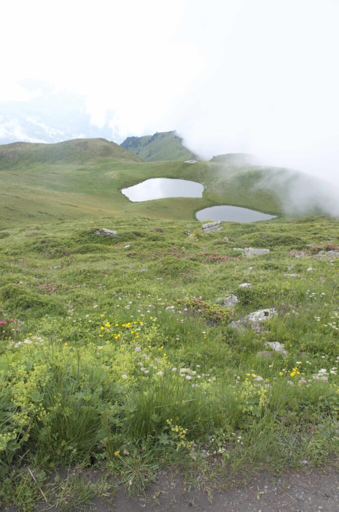 让娃玩尽兴以后,我们才开始徒步去Kleine Scheidegg。这条线路大约五公里,基本是平的土路,很容易。美中不足的是,云多起来了,一路上没能看到连绵起伏的山峰,哭。唯有看看花儿啊草儿的。大概也正因为天气欠佳,真没别人。