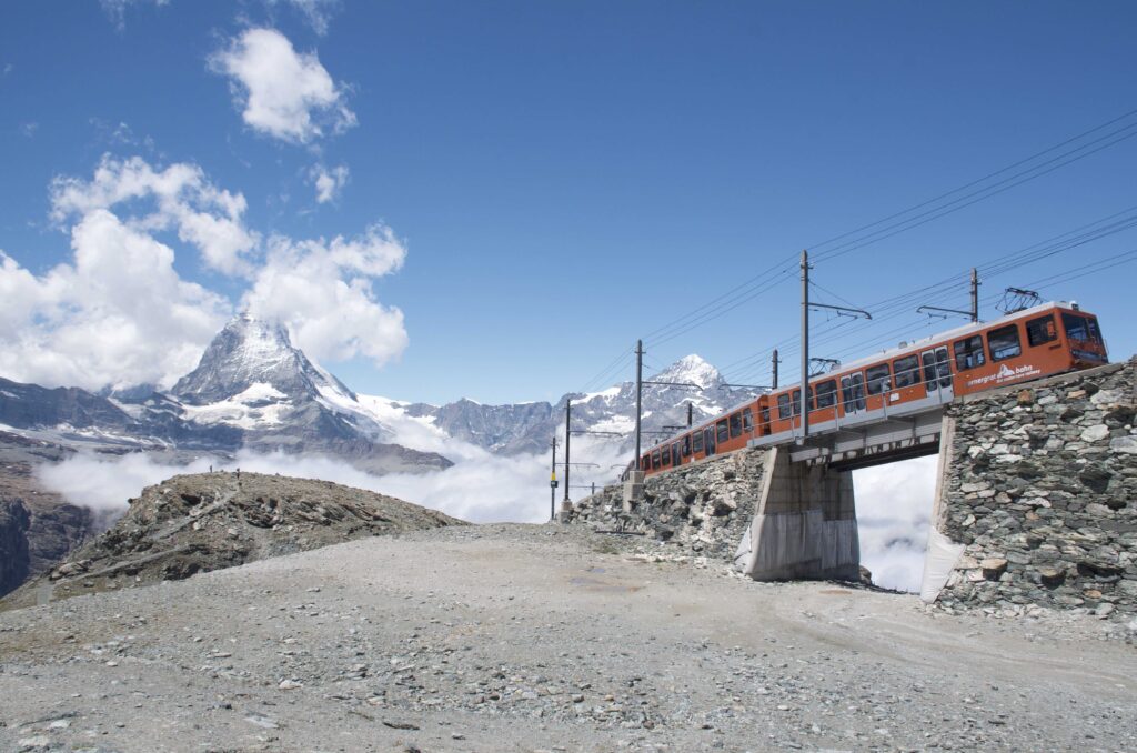 那天夜里下了雷雨,我们的房间有个天窗,我好像还拍到了闪电呢。第二天清早还在下雨,我们当然就没必要赶去拍马特洪峰的倒影什么了,在宾馆(推荐一下Walliserhof)美美吃了丰盛的早餐。吃完还在下雨,那就在房间里休息吧。一直到了十点半,雨终于停了,眼看云有要散去的意思,我们赶紧去火车站(gornergrat barn)买票上山!买到了11:12的火车。